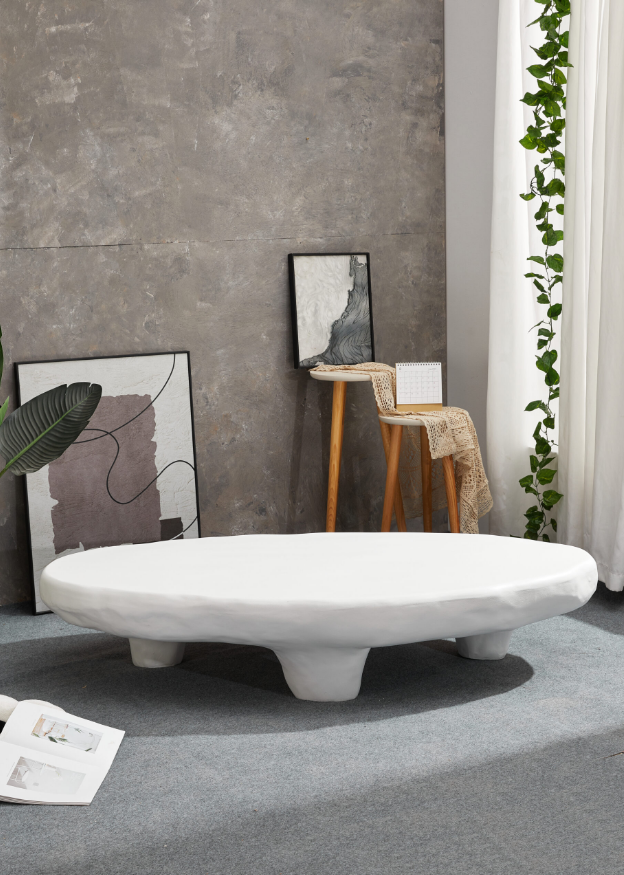 This Modern Short Tripod White Coffee Table 2125. This coffee table is mainly made of magnesium oxide and presents a pure white appearance.Its design is full of personality. The unique short tripod shape makes it stand out among many furniture. Whether placed in a warm home or used in commercial places, it can show its unique charm.